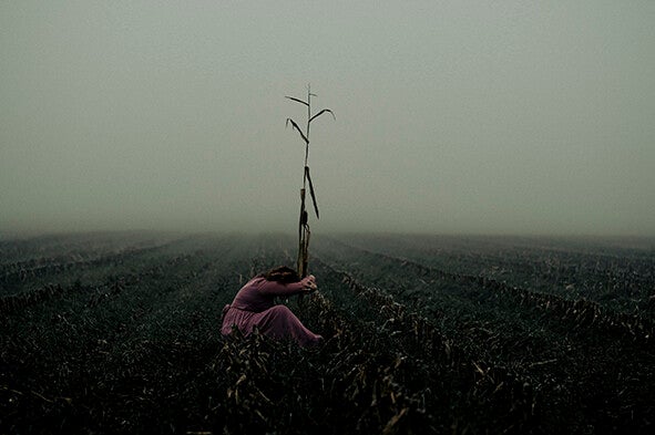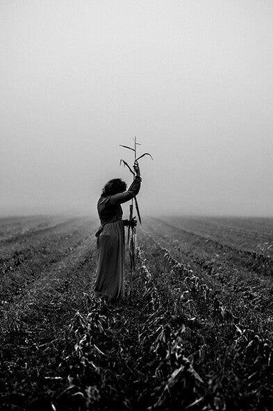 Het beeld werd gemaakt bij zonsopkomst. De zon was aanwezig, maar verborgen achter mist. Net als mijn gevoel toen: voelbaar, maar niet helder. In een bijna leeg maisveld bleef één stengel overeind staan. Die ene, dat ben ik.