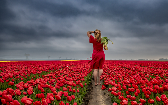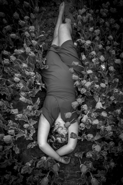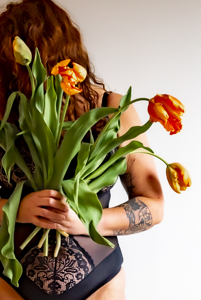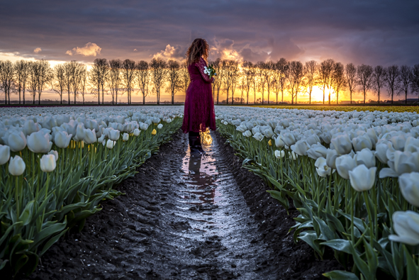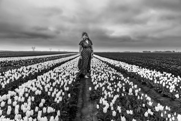 Vaak spelen bloemen een rol in mijn beelden — vooral tulpen. Hun vorm, kwetsbaarheid en kracht raken iets dat ik moeilijk in woorden kan vatten. Ze staan voor groei, loslaten en durven bloeien — net als wij.